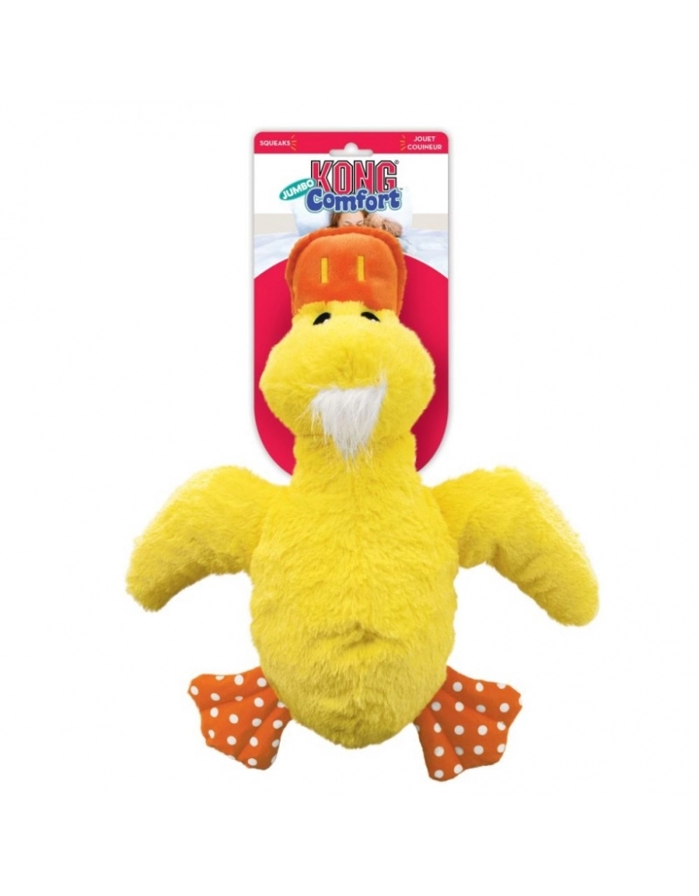 O KONG Comfort Jumbo possui um corpo extragrande que proporciona uma diversão muito maior para os cães. Os estalidos aumentam o envolvimento e despertam instintos naturais de sacudir, prorrogando a brincadeira. Apitos e um exterior de pelúcia irresistivelmente macio, combinados em um corpo gigante e aconchegante, proporcionam conforto em grande estilo aos cães sortudos. Ideal para brincadeiras em ambiente fechado e para a hora da soneca.