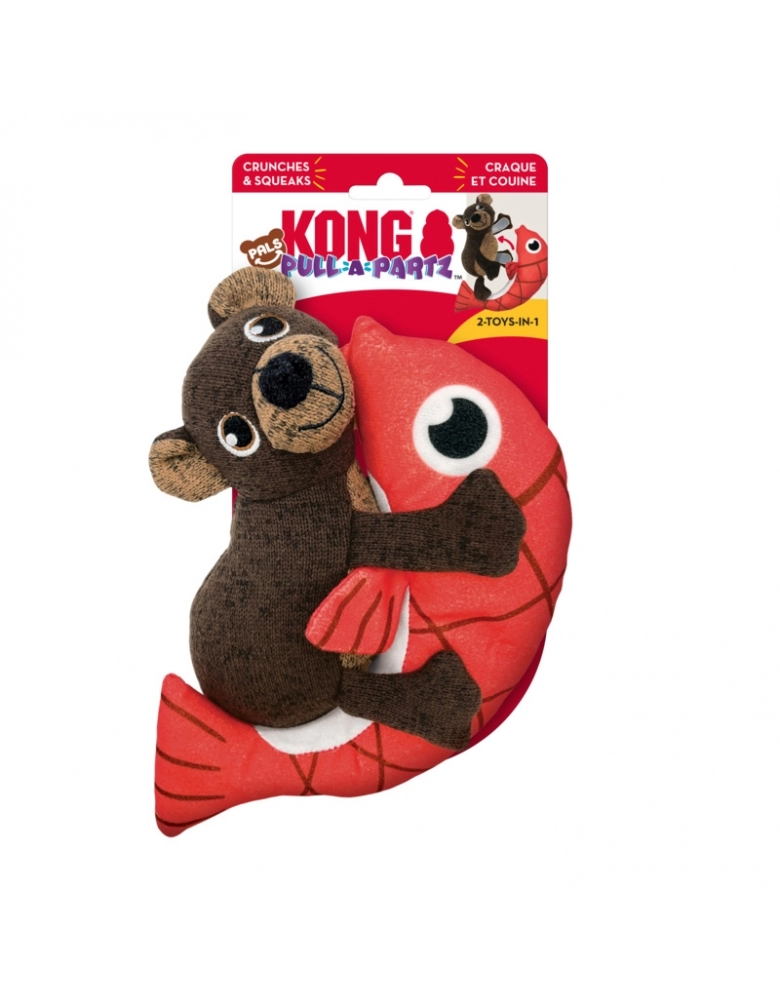 KONG Pull-a-Partz Pals Monkey é um brinquedo desenvolvido para cães de mordida leve e não destruidores. São 2 brinquedos em 1 para brincadeiras de jogar e trazer ou aconchego. Separar os brinquedos, que são ligados por um velcro, satisfaz instintos naturais dos cães. Apitos e estalidos prolongam a diversão e estimulam ainda mais.