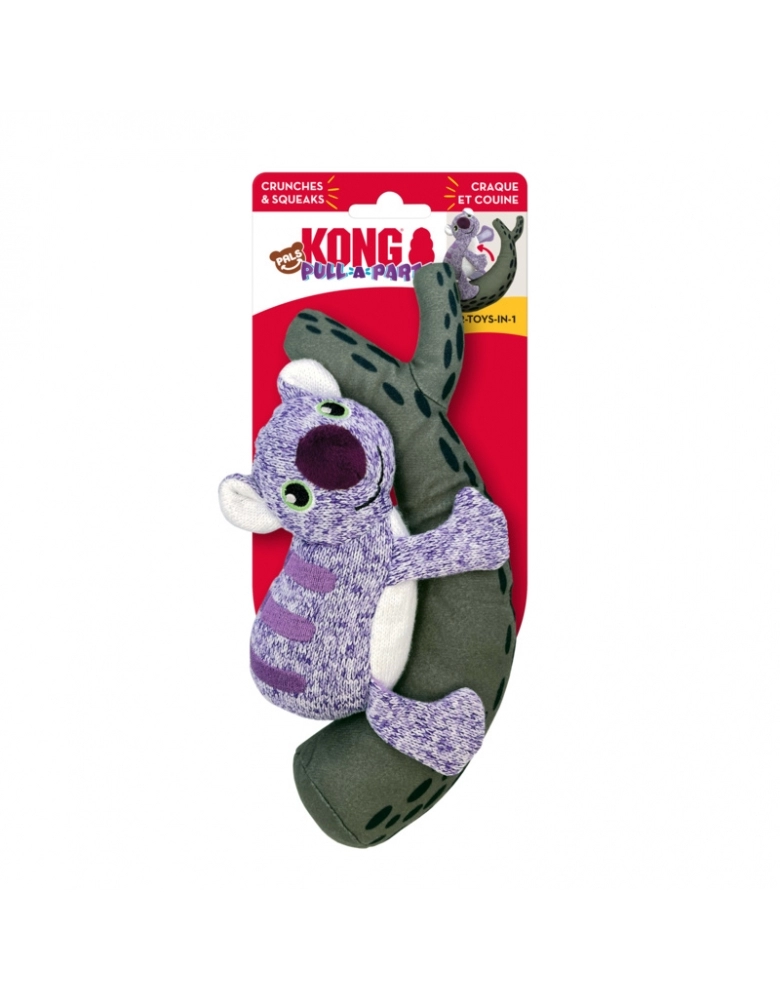 KONG Pull-a-Partz Pals Monkey é um brinquedo desenvolvido para cães de mordida leve e não destruidores. São 2 brinquedos em 1 para brincadeiras de jogar e trazer ou aconchego. Separar os brinquedos, que são ligados por um velcro, satisfaz instintos naturais dos cães. Apitos e estalidos prolongam a diversão e estimulam ainda mais.