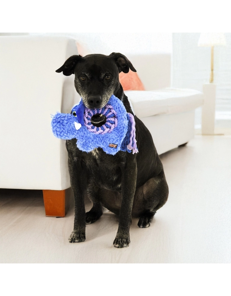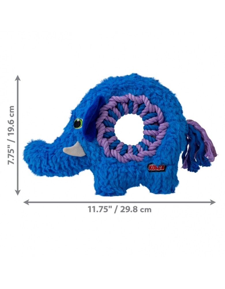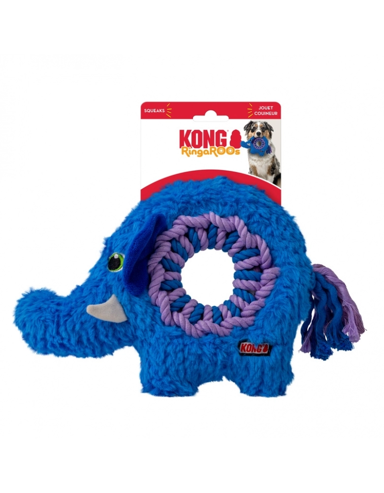 Kong Ringaroos é um brinquedo feito com corda em formato de anel encapada com pelúcia para uma brincadeira pesada, mas ao mesmo tempo, confortável. Ideal para brincadeiras interativas de cabo de guerra e com mordidas divertidas. Possui apito para aumentar o engajamento. Possui várias texturas para estímulos variados e, até, aconchego.