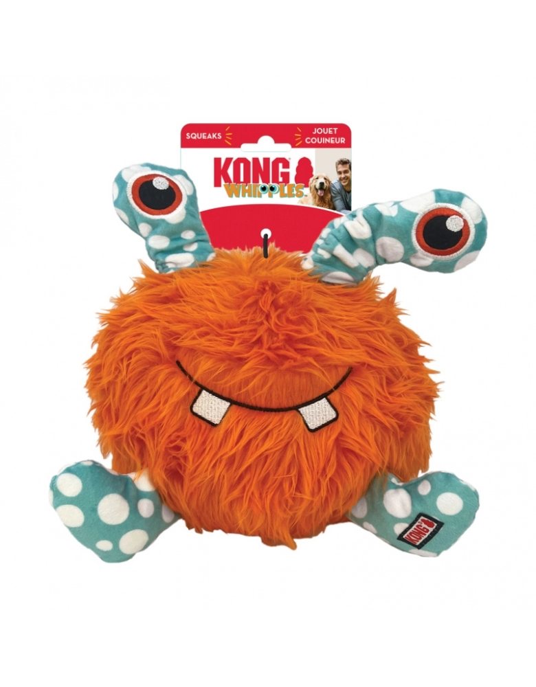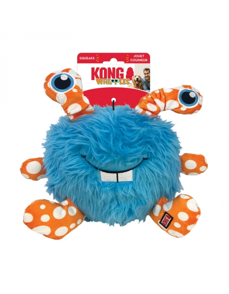 KONG Whipples é um brinquedo extra grande para aumentar a diversão para todos os tamanhos de cães. Mas é desenvolvido para cães de mordida leve/moderada apenas. Possui um apito grande, fácil de localizar, que é acionado facilmente, para estimular ainda mais a brincadeira. Olhos, pernas e braços tornam-no fácil de agarrar para qualquer tamanho de cão.