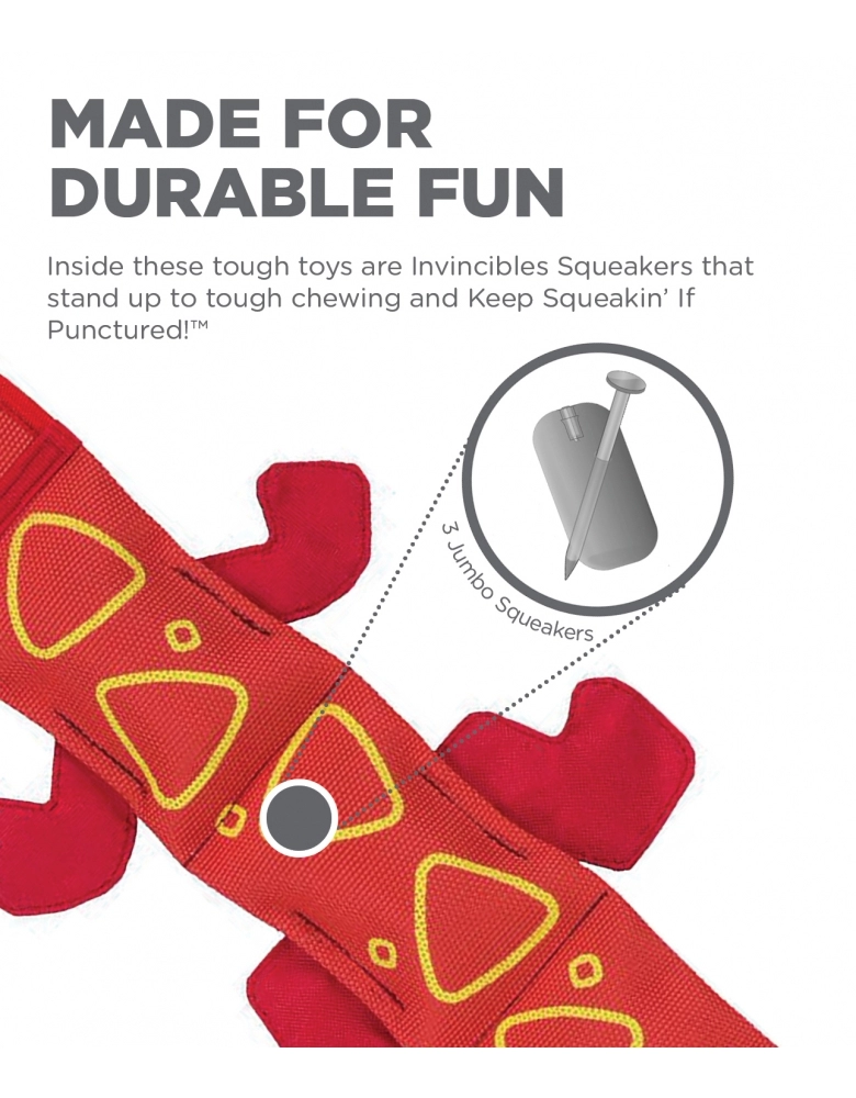 Dedicado à cães de mordida moderada a forte. Construído com o que há de mais resistente pela Outward Hound, tornando-se o brinquedo mais resistente da marca. Possui um liner especial K9, tecido de mangueira de bombeiro e apitos chamados “invincibles” que continuam apitando mesmo que perfurados. Seu corpo achatado e com os apitos encapados tornam um brinquedo ideal para lutas intermináveis e brincadeiras de cabo de guerra. 60cm de pura diversão.