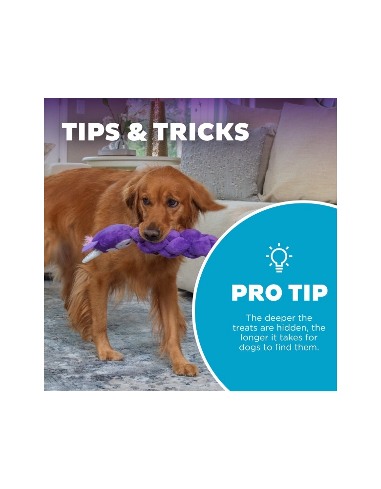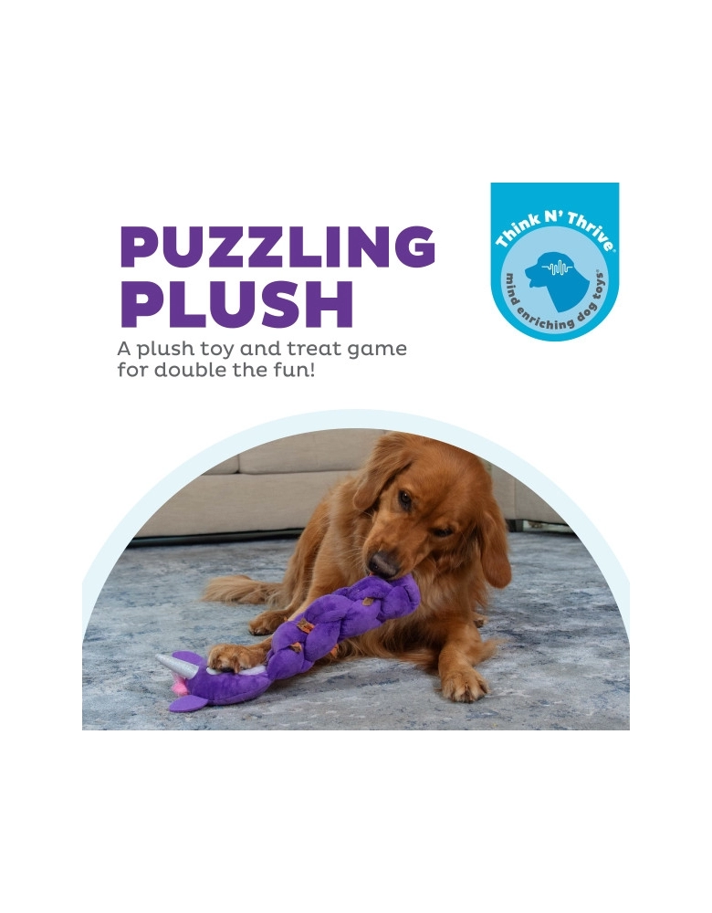 O quebra-cabeça de pelúcia para cães Nina Ottosson Puzzle Palz combina um brinquedo de pelúcia para cães com um quebra-cabeça de petiscos para cães, proporcionando uma diversão estimulante que seu cão não conseguirá resistir! Esse brinquedo acrescenta um desafio mental às brincadeiras enquanto ele se esforça para retirar os petiscos entre os nós do brinquedo. Ele usará o cérebro, as patas e o nariz para buscar as recompensas. Mesmo depois que as guloseimas acabarem, a textura do brinquedo e o apito mantém o interesse de seu cão.