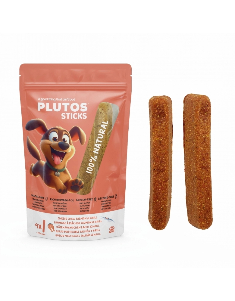 PLUTOS STICKS são 100% NATURAIS e feitos com proteína de leite de alta qualidade, rica em aminoácidos essenciais e proteínas premium. As versões Salmão & Krill, são também ricas em ómega-3 e astaxantina. Os nossos sticks são isentos de lactose e glúten e têm sabores irresistíveis. Não lascam, permitindo que os cães os mastiguem e desfrutem até ao fim. Os PLUTOS Sticks contêm caseína, uma proteína do leite com efeito antibacteriano, que neutraliza as bactérias nos dentes, prevenindo a formação de placa e eliminando o mau hálito.