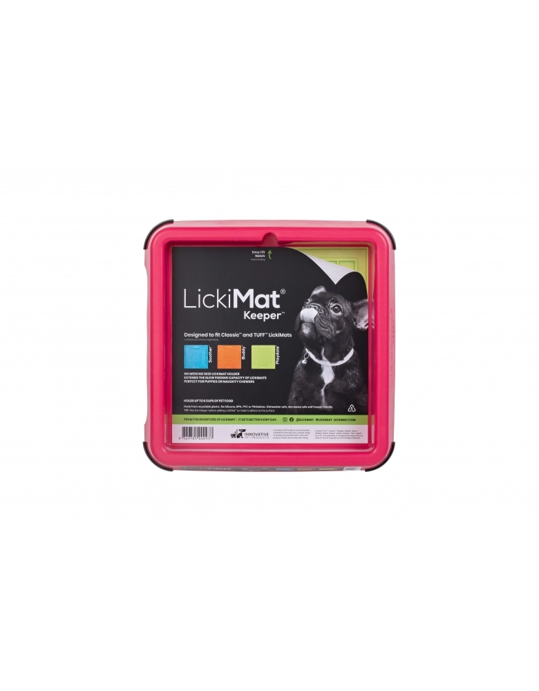 O ato de lamber libera endorfina. Os cães lambem para se acalmarem quando estressados. Por isso a Lickimat lança produtos perfeitos para ansiedade, distração, banho e tosa, treinamentos e tempestades por conta do medo de trovões. LickiMat Keeper foi desenvolvido para colocar um lickimat dentro, evitando que o alimento se espalhe pelo chão e mantendo o LickiMat firme, sem derrapar. Serve para LickiMats Clássicos e Tuff. Capacidade de 6 xícaras de alimento