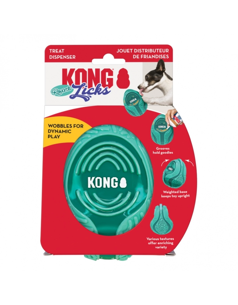 KONG Licks Rewards é mais divertido e mais desafiador que um simples tapete de lamber. Possui uma base pesada que faz com que o produto balance para uma brincadeira mais dinâmica. Sua superfície texturizada permite que você passe algum alimento cremoso como pasta de amendoim ou patê para que o cão lamba, o que libera hormônios de felicidade e ajuda a manter a saúde oral. As texturas variadas mantém os cães interessados e o balanço aumenta o desafio e mantém o brinquedo no lugar, tornando a brincadeira duradoura e este brinquedo uma ferramenta importante no enriquecimento ambiental.
