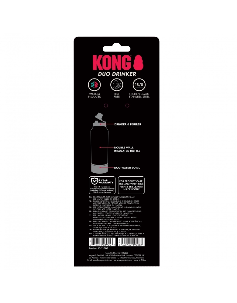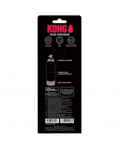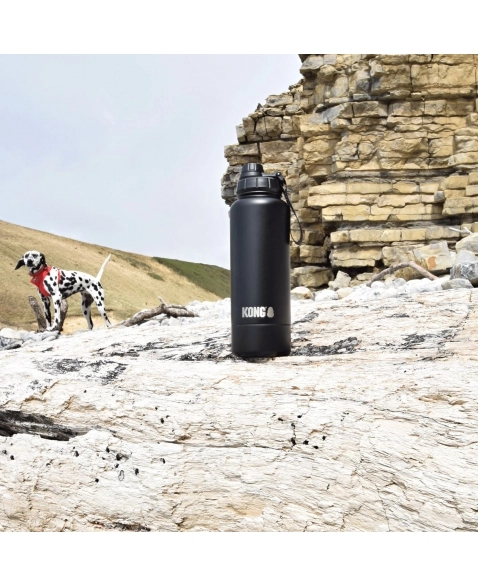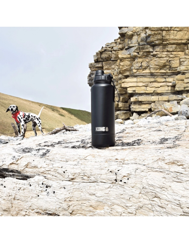 A garrafa KONG Duo Drinker é a solução ideal para donos de cães ativos que gostam de sair juntos. Esta garrafa de 910 ml com parede dupla e isolamento a vácuo mantém a água fresca durante muito tempo e oferece uma solução inteligente 2 em 1: uma pequena abertura para beber para si e um recipiente integrado de rosca para o seu cão. Prática durante passeios, caminhadas ou viagens de carro.